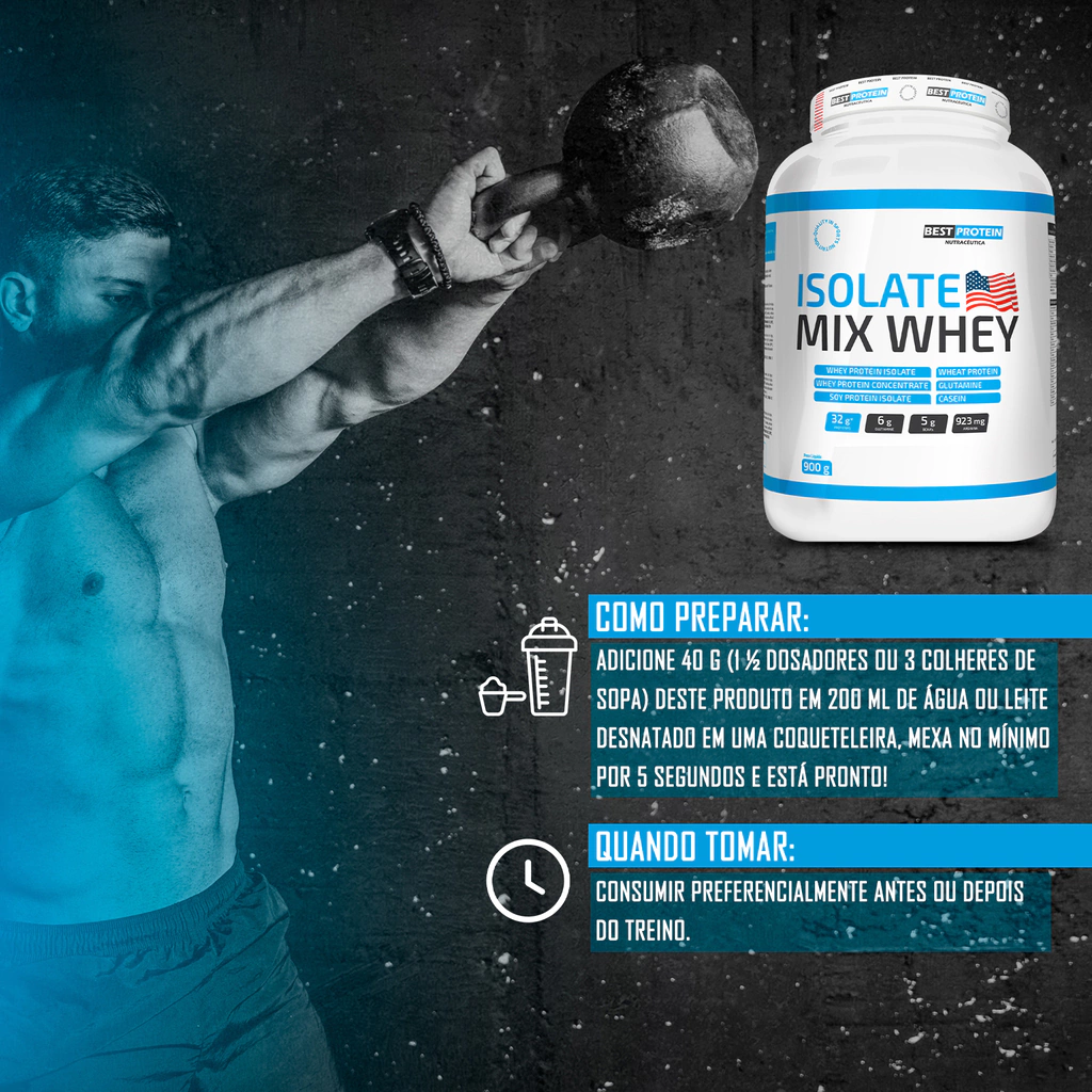 Com fórmula avançada e completa, o Isolate Mix Whey da Best Protein combina diferentes fontes proteicas (WPI, WPC, caseína, proteína de soja e trigo), além de ser enriquecido com glutamina, BCAAs e arginina. Fornece 32 g de proteínas por dose, auxiliando no ganho e manutenção de massa magra, recuperação muscular e melhor desempenho físico.