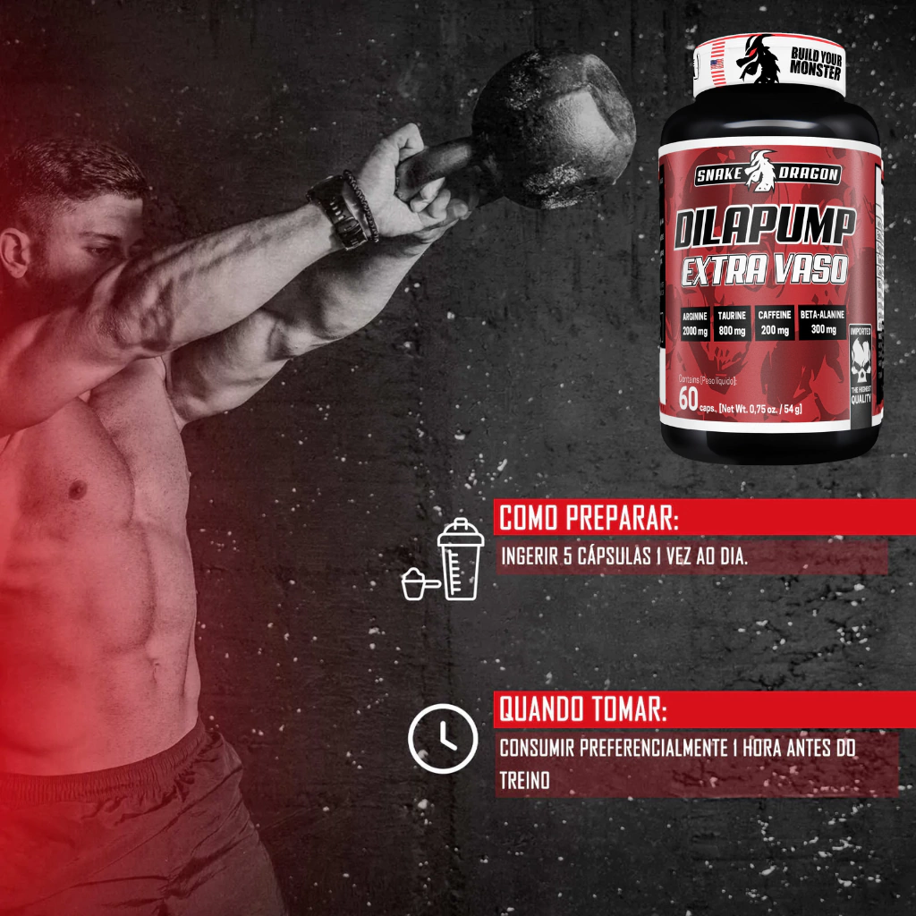 O Dilapump Extra Vaso é um potente pré-treino formulado para proporcionar máxima vasodilatação, foco e resistência. Sua composição inclui Arginina, Taurina, Cafeína e Beta-Alanina, garantindo energia explosiva e um pump muscular intenso.