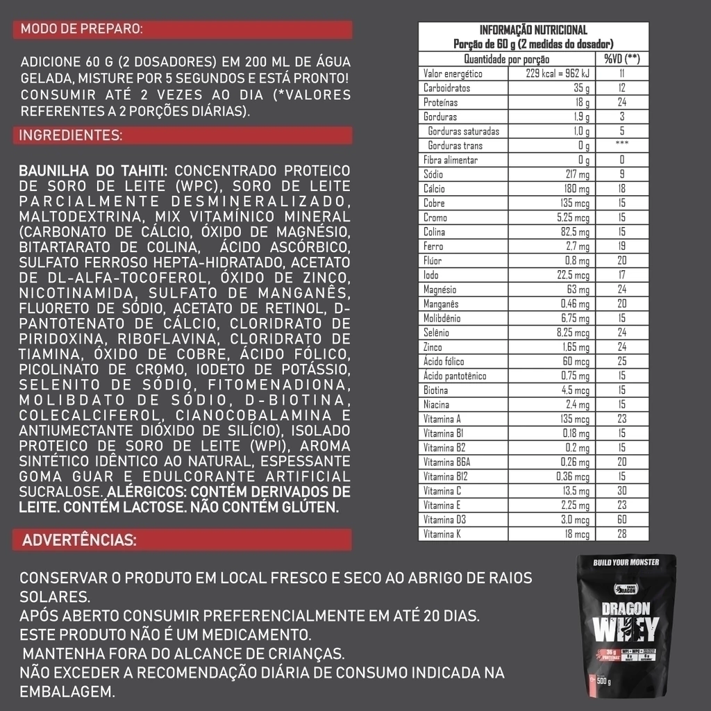 Dragon Whey 500g: O Dragon Whey é um suplemento de whey protein premium com 500g de proteína pura. Formulado para fornecer aminoácidos essenciais de rápida absorção, é ideal para promover o crescimento muscular e a recuperação após treinos intensos.