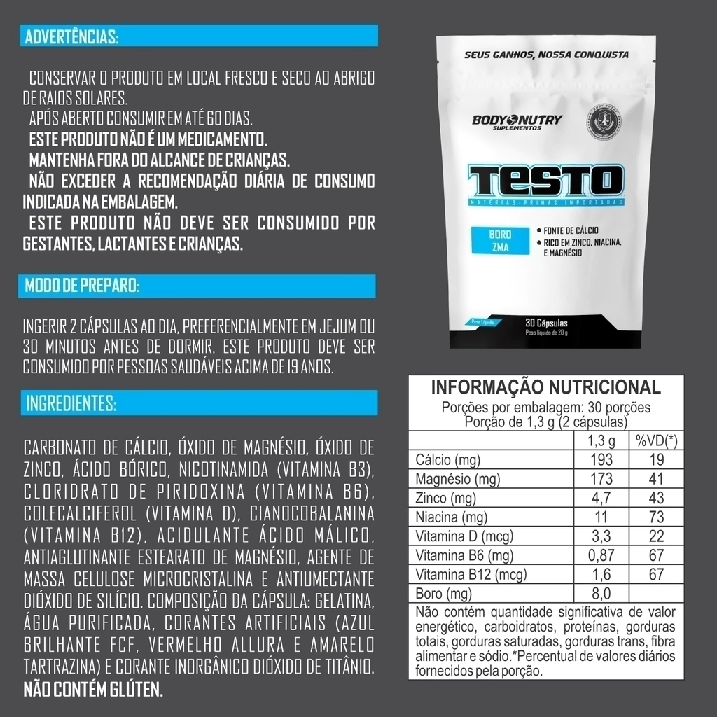 Testo Body Nutry 30 Cápsulas (2x): O Testo Body Nutry é um suplemento desenvolvido para apoiar a produção natural de testosterona, promovendo ganhos de força e massa muscular. Com duas embalagens de 30 cápsulas cada, você terá suporte contínuo para melhorar seu desempenho atlético e acelerar a recuperação.