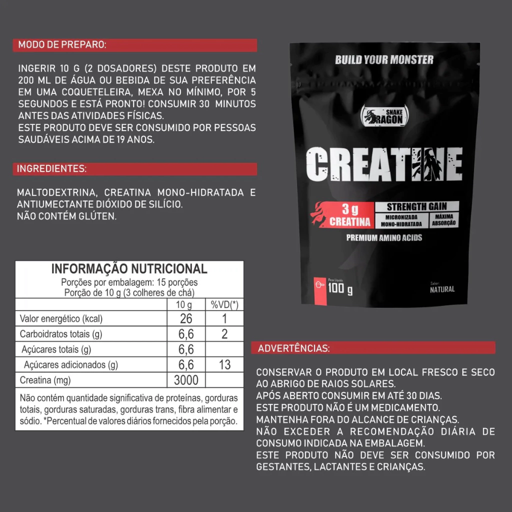 Creatina 100 g Snake Dragon: A Creatina Snake Dragon é formulada para aumentar a força, potência e resistência muscular. Com 100 g de produto, é ideal para intensificar seus treinos e promover ganhos musculares significativos.