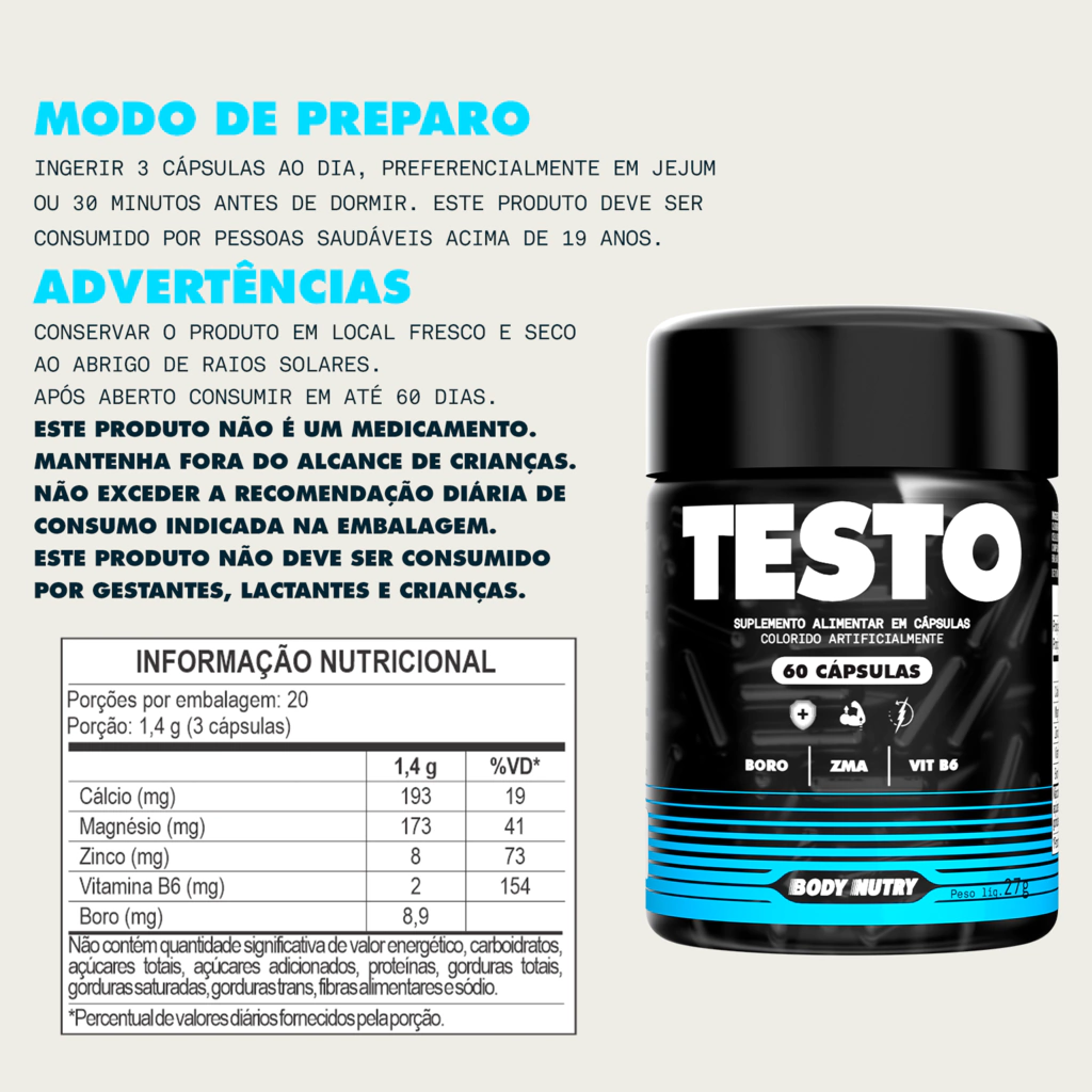 O Testo auxilia no suporte hormonal masculino e na otimização do desempenho físico e sexual. Formulado com Boro, ZMA e Vitamina B6, contribui para o aumento da testosterona, melhora da força muscular, recuperação e vitalidade geral.