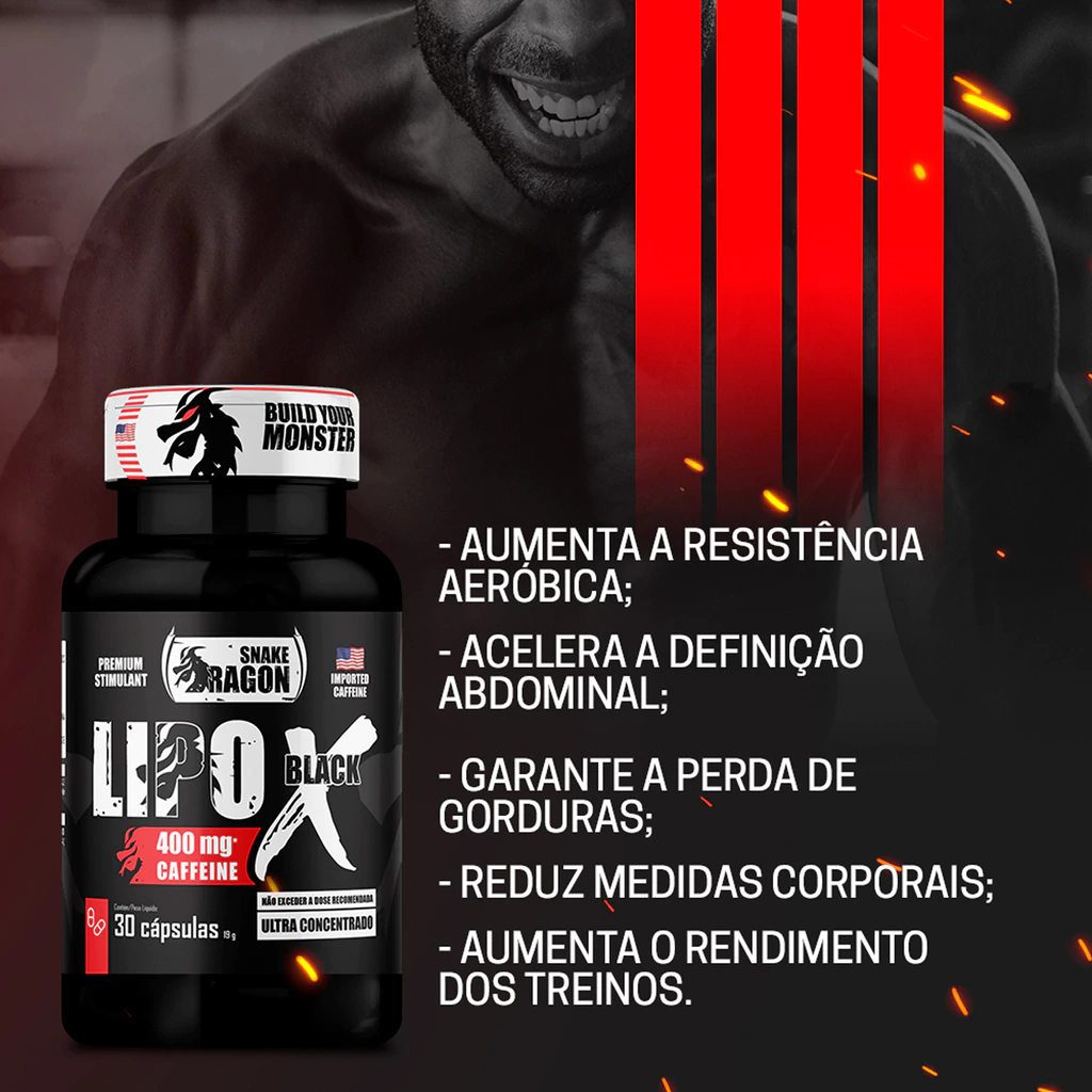 O Lipo X Black da Snake Dragon é um suplemento em cápsulas com 400 mg de cafeína por dose. Sua fórmula ultra concentrada auxilia no aumento da energia, foco e disposição, contribuindo para melhor desempenho físico e mental durante os treinos. Além disso, é um aliado na queima de gordura, definição corporal e resistência em atividades intensas.