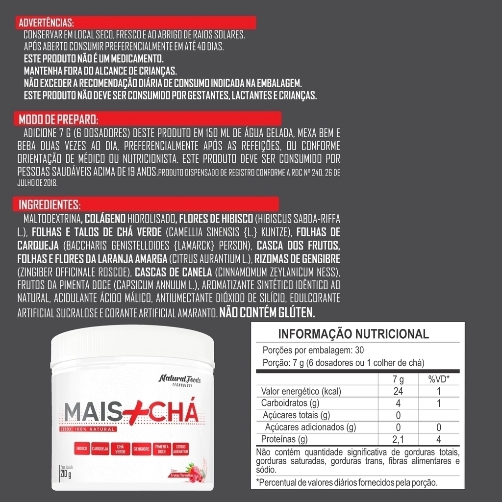 Descubra a força do Mais Chá da Natural Foods! Um suplemento em pó 100% natural, desenvolvido com ingredientes como hibisco, carqueja, chá verde, gengibre, pimenta doce e citrus aurantium, além de colágeno hidrolisado, que juntos oferecem suporte detox, energia e equilíbrio para o dia a dia. Cada pote traz 210 g, garantindo rendimento para 30 dias, em uma fórmula prática, saborosa e livre de glúten.