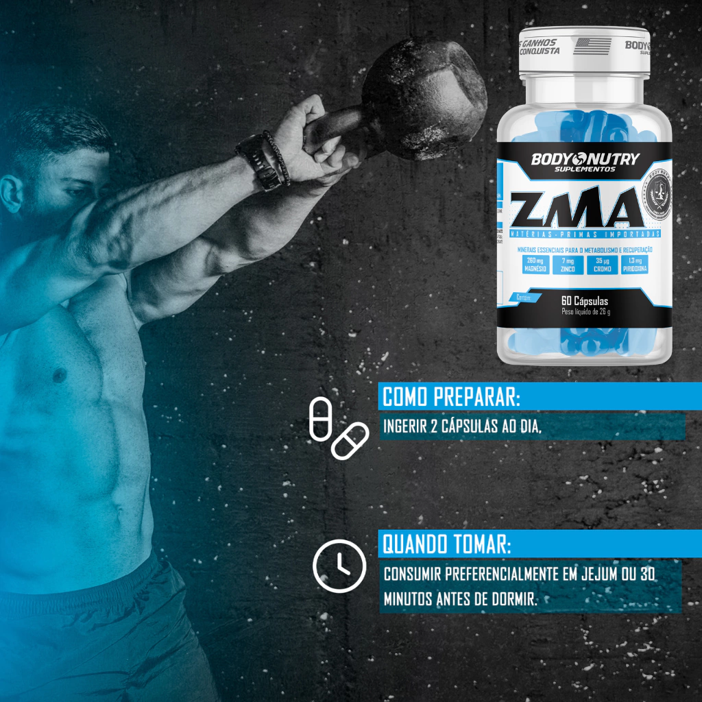 O ZMA Body Nutry é um suplemento alimentar em cápsulas formulado com magnésio, zinco, vitamina B6 e picolinato de cromo. Esses nutrientes são essenciais para o metabolismo energético, recuperação muscular, função hormonal e melhora da qualidade do sono.